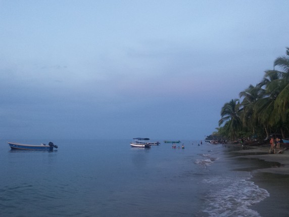 Vamos a cenar a Puerto Viejo, uno de los destinos más importantes del mundo para hacer surf, por tener la más grande y poderosa ola de Costa Rica, llamada "Salsa Brava". Supongo que es por ello que se ha convertido en otro "Kao San Rd", donde los occidentales superan claramente a la población local. Hay una amplia variedad de hoteles, restaurantes, bares, discotecas, y sobre todo, decenas de puestos y tiendas de souvenirs pensadas claramente para el turista occidental. O sea, el lugar donde no quiero estar. Aunque si quieres efectivo hay que pasar por aquí, tiene los dos únicos cajeros automáticos de la zona.