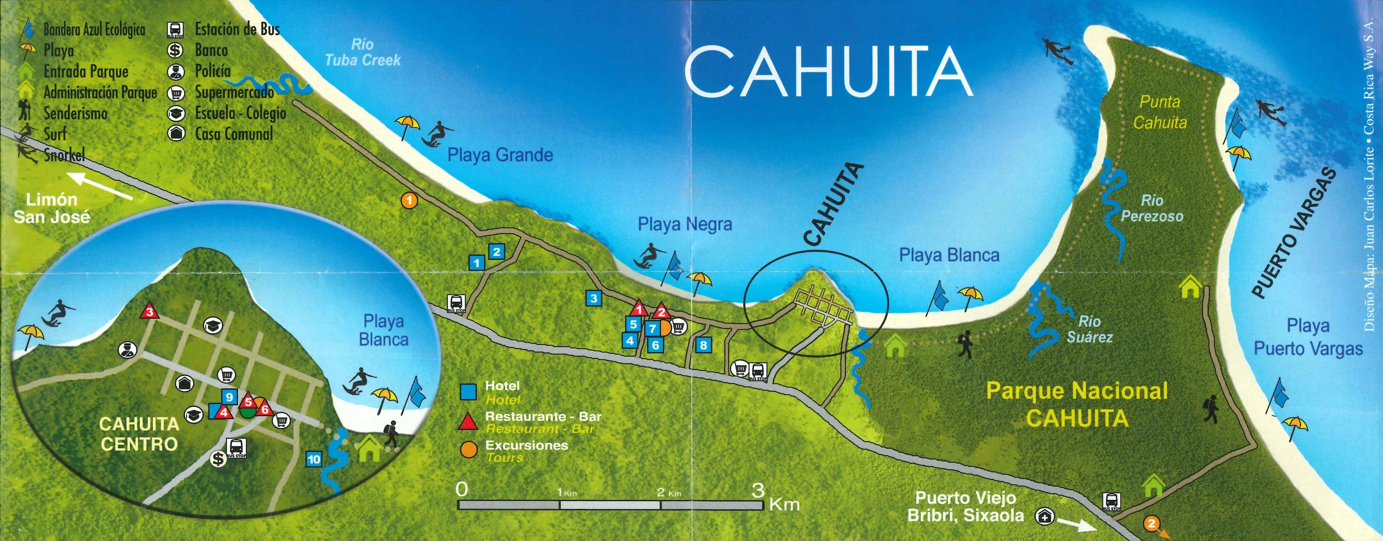 Cahuita está a 40 km de Manzanillo y 15 km de Puerto Viejo. Es un pueblo pequeño, la calle principal son apenas 500 mts, alberga básicamente restaurantes, un supermercado, una heladería, y un par de tiendas de