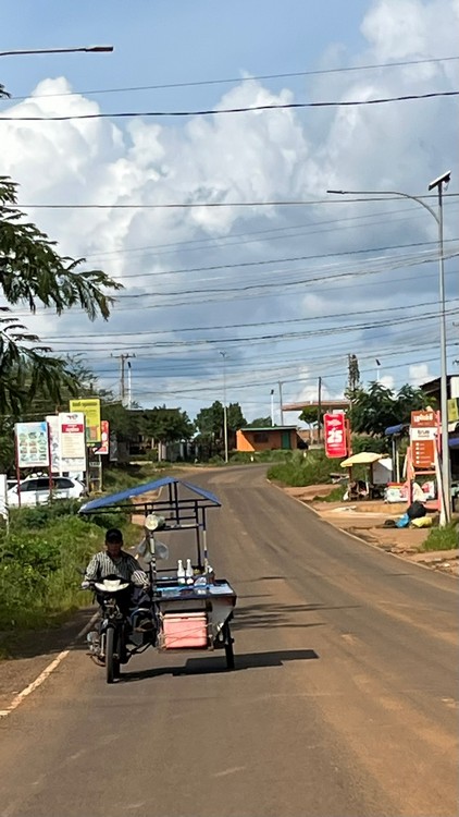 rickshaw (carro de dos ruedas tirado por una persona), muy usado en diferentes partes de Asia sobre todo como taxi. El conductor va sentado delante, frente al manillar, detrás pueden sentarse hasta tres personas (tamaño asiático). Para conducirlo en Camboya hace falta el carnet internacional, que desde el propio
