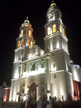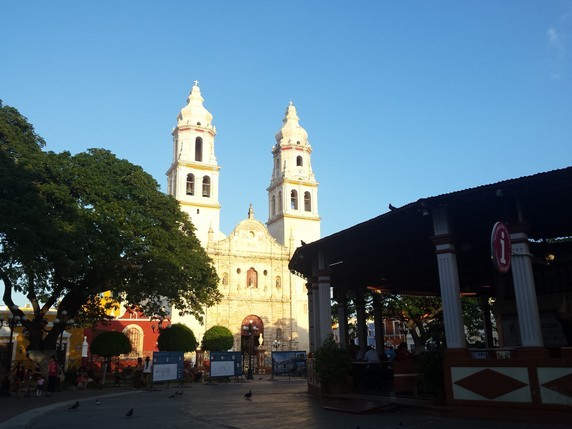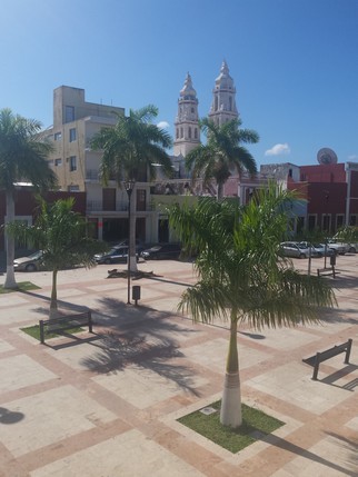Si hay que elegir algún lugar como el centro del centro este es la Plaza de la Independencia, una plaza ajardinada cercada por un enrejado de forja, y presidida por una preciosa glorieta convertida en bar terraza, la rodean la Biblioteca Municipal, el Centro Cultural Casa Nº 6, la Catedral de Nuestra Señora. de la Purísima Concepción, la Casa Vieja, y el Baluarte de la Soledad, la puerta más grande de las ocho que unían la muralla, y que actualmente alberga el Museo de Arquitectura Maya. Cada noche, sobre la pared porticada de la Biblioteca, se muestra una espectacular proyección sonora sobre la historia de la ciudad. La plaza es un lugar muy popular, la gente acude a pasear, a misas en la catedral, o a tomar algo en las terrazas de las calles peatonales que la rodean. Desde la plaza salen unos pequeños trenes turísticos que recorren la ciudad, 45 min. 120 MXN.