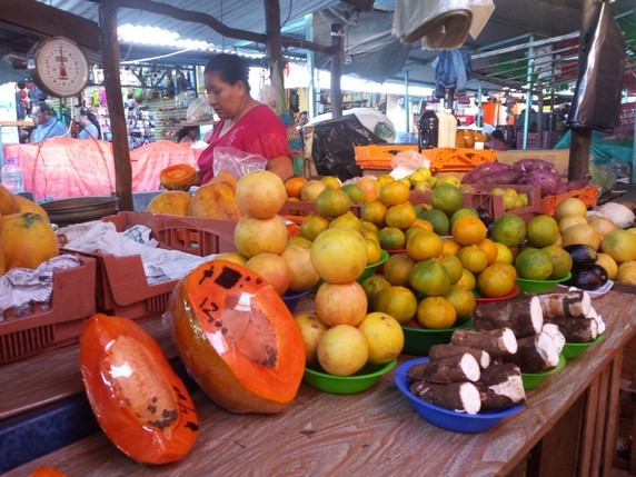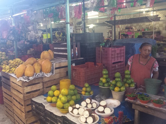 Mercado Pedro Sainz de Baranda, lleno a reventar, donde además de los típicos puestos de frutas, verduras, carne y pescado, hay varios locales con buena pinta donde desayunar. Compramos cinco manzanas (15 MXN), una bolsa de nachos (10 MXN). En una farmacia compramos un anti mosquitos local y unos caramelos, 84 MXN.