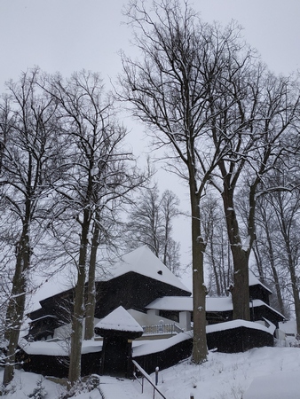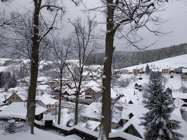 Cuando salimos de Bojnice ya ha anochecido, queremos seguir un poco más dirección norte hasta Martin, donde pasaremos la noche. Al poco empieza a nevar, la carretera está completamente blanca y no se ve mucho, pero el asfalto está en buen estado, lso reflectantes de los guardarailes se ven con claridad y los neumáticos de invierno aguantan sin problemas.