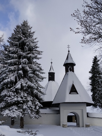 Iglesia de Leštiny, construida en 1689 como una simple estructura rústica de madera sin torre ni campanas, las paredes interiores están pintadas con murales de los siglos XVII y XVIII, los bancos están decorados con escudos de armas, y posee un baptisterio renacentista es del siglo XVII. Aunque todo esto hay que adivinarlo mirando por las ventanas desde del exterior, ya que, aunque el acceso al patio está abierto, la puerta del templo está cerrada.