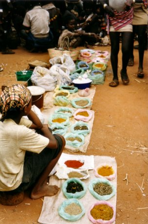 Mercats. L’aparença dels mercats és molt caòtica però tot esta degudament organitzat, no existeixen parades, la mercaderia esta al terra o en el millor dels casos sobre una lona, venen ampolles de plàstic, una mica de fruita, patates, cebes, tuberculós, especies, llavors, cotó, boles d’encens per a la cerimònia del cafè, oli per als llums, tech (un fort licor local), chad (la droga local que es mastega), llenya, res d’animals vius, i res que pugui interessar-li a un occidental... Tot això amb animals vius per al mig com vaques, gallines...No hi ha roba, ni souvenirs ni coses d’aquestes, només es venen coses realment útils.