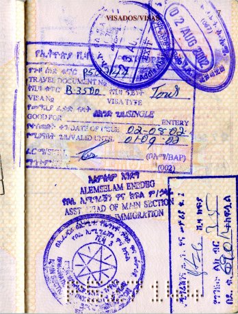 Visat. No hi ha ambaixada etíop a Espanya, la documentació cal enviar-la a París per missatger, amb franqueig de tornada pagat, els diners en efectiu dintre del sobre i dues fotos mida carnet. Tot molt complicat, i el teu passaport donant voltes per mitja Europa... També es pot aconseguir directament a l’aeroport de Addis Abeba per 320 birr (60$) en poc més de mitja hora, un visat valit per a un mes. No són necessàries fotografies i si només duus euros, no et preocupis, hi ha oficina de canvi al mateix aeroport. Mes informació a Servicios Consulares del