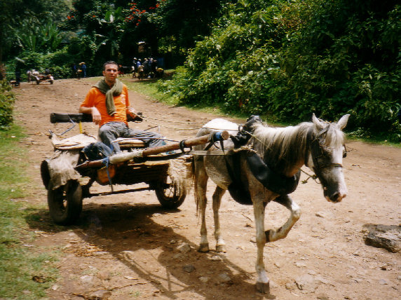 Gari. Vehicle de transport usat en algunes ciutats del sud, consistent en un carretó arrosegat per un cavall. Caben dues persones mes el conductor. 5 birr trajecte de 15 minuts.