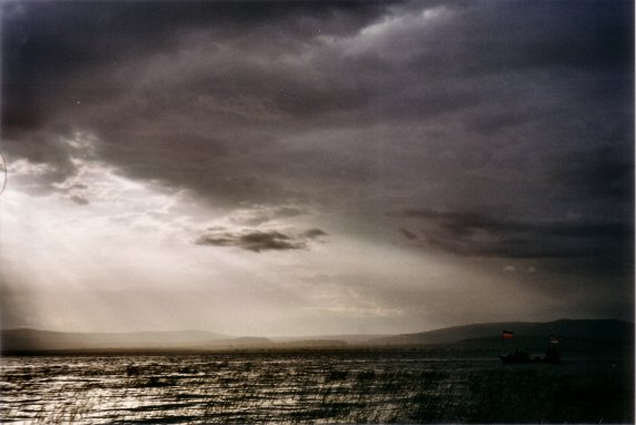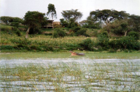 llac Awasa a veure hipopòtams. Aquí la barca és a rems, i massa gran perquè la dugui una sola persona, dos nois joves es van alternant, un d’ells no deixa de mastegar xat. Els hipopòtams són molt mes difícils de veure que els cocodrils, és un animal tímid i quan ens veu s’amaga sota l’aigua. Aquesta timidesa esta combinada amb una enorme agressivitat, sembla ser que amb motiu de defensar el territori i les criatures. Degut al fet que la nostra barca és de rems no ens vam apropar tant com al llac Chamo, només un parell de fotos. A la volta gairebé ens agafa la tempesta.