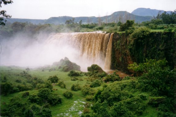 Naixement del Nil. A 32 km de Bahar Donar es troba Tis Isat (Smoking Fire), el naixement del Nil Blau. Amb 400 mts d’ample i 45 de caiguda vertical, és un dels salts d’aigua més espectaculars del món. Envoltada d’exuberant vegetació la cascada s’endevina des d’un quilòmetre de distància, una enorme fumarada blanca generada pel vapor d’aigua que rebota contra el terra ens indica la seva ubicació. És necessari contractar un guia (50 birr), el nostre acabava de sortir d’un episodi de malària una setmana endarrere en el qual va morir el seu pare. Aquí hem tingut l’experiència graciosa del viatge, uns etíops que estaven de vacances es van voler fer unes fotos amb nosaltres.