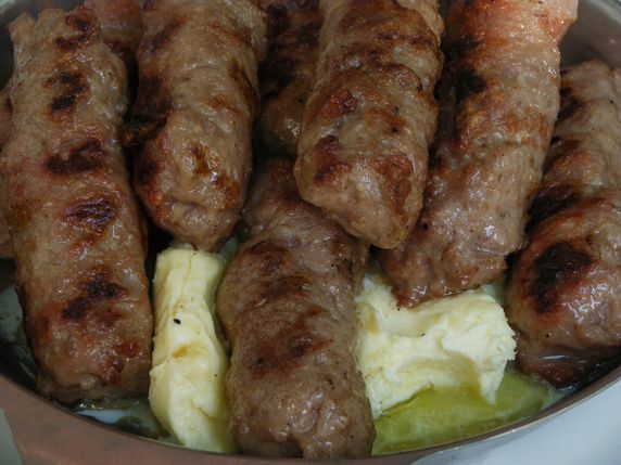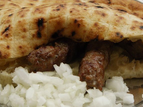 cevapi, petites saltxitxes de barreja de carn de be i vedella especiada. En general, se serveix amb ceba fresca i pa de pita. Solen ser de la mida d'un dit, i entren entre cinc o deu peces per ració.
