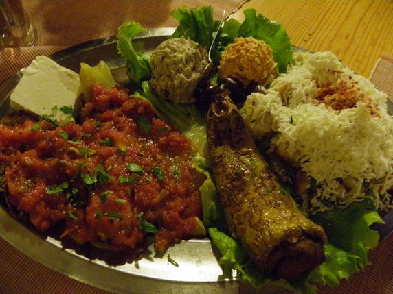 argatska appetizer que afegia tires fines de de porc i vedella, carn picada i xampinyons.