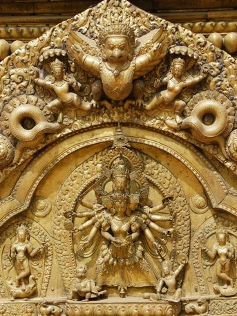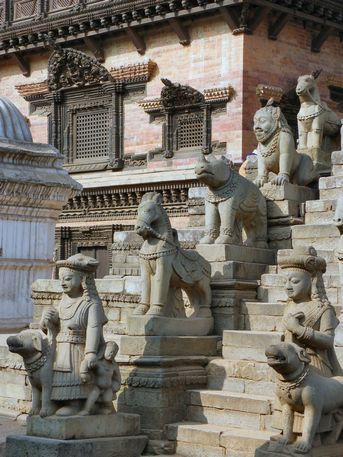 Temple de Siddhi Lakshmi, un temple hindú de pedra les escales d'accés del qual estan flanquejades per diferents animals guardians. Girant la cantonada trobem uns