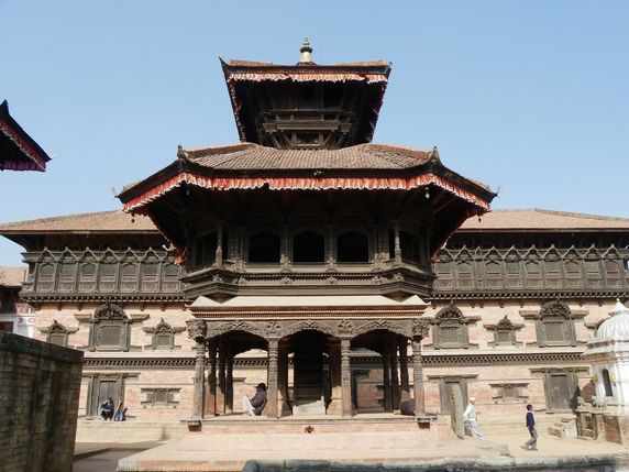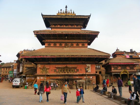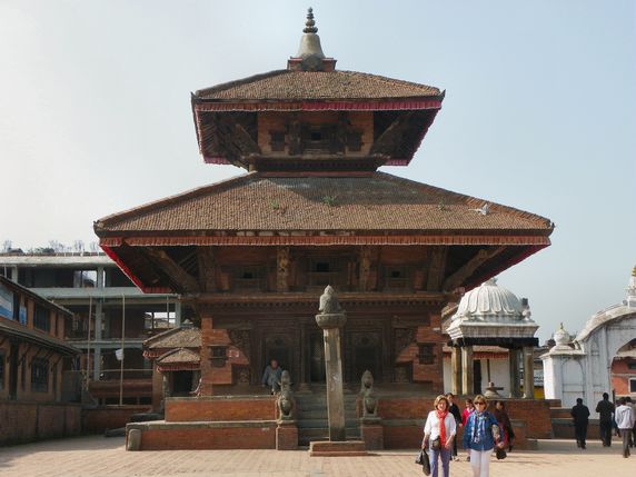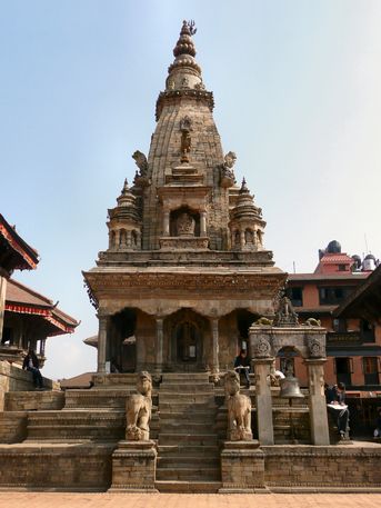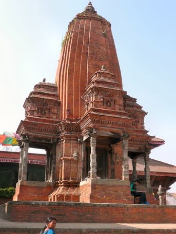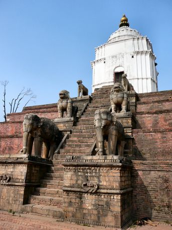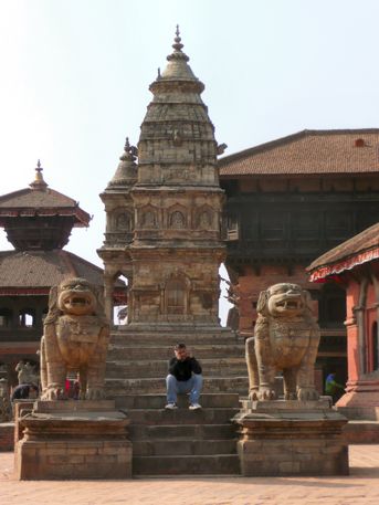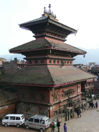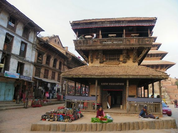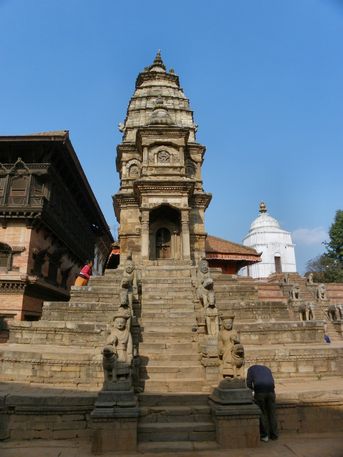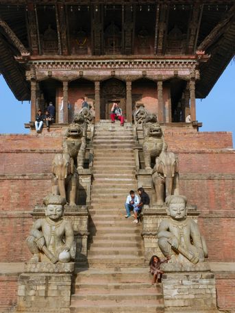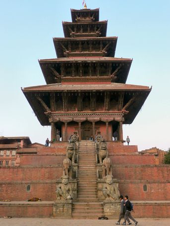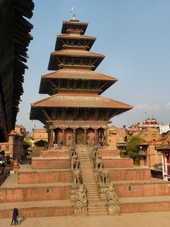 Temple de Nyatapola (1702), dedicat a la deessa Lakshmi, que amb les seves cinc teulades i 30 mts d'altura és el mes alt de Nepal. L'escala principal de la pagoda esta tota ella vorejada de figures guardians que incrementen el seu poder conforme ascendim i ens apropem al santuari, cadascun d'ells és deu vegades més poderós que l'anterior. A l'altre costat de la plaça el