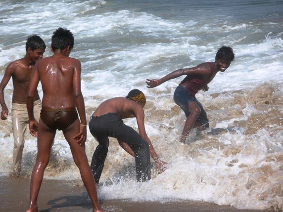 platja Marina, que amb els seus 12 km es la segona platja més llarga del món. Des del passeig fins a la riba cal caminar almenys cinc-cents metres sobre la sorra. Aquí els corrents són molt perilloses, així que per increïble que sembli, la platja només serveix de decorat per a passejar durant la posada de sol, o per a jugar algun improvisat partit de cricket. Està plena de gent mullant-se els peus, nens jugant a la pilota en la riba, parelles assegudes a les barques bolcades sobre la sorra, i xarxes de pesca deixades assecar al sol que desprenen una forta olor a peix. Per a la nostra sorpresa no hi ha ni corbs ni gavines.