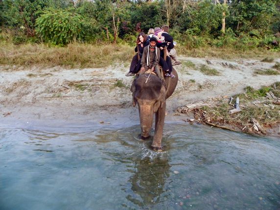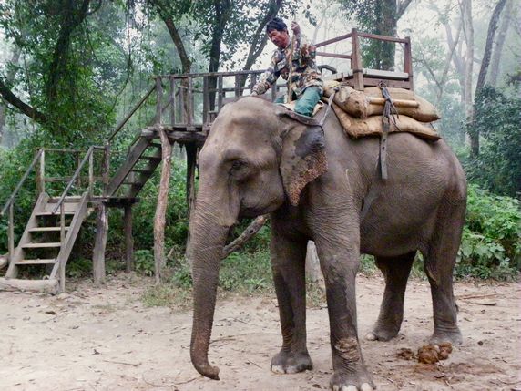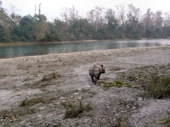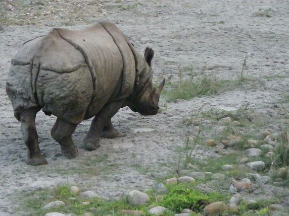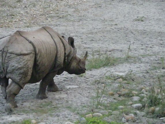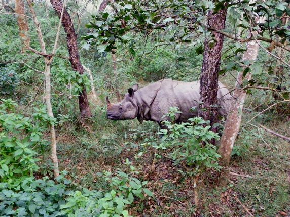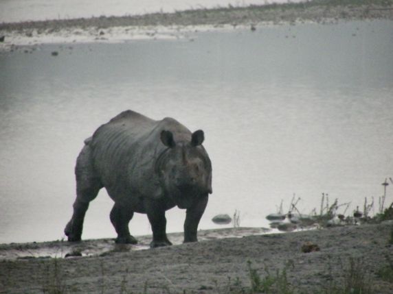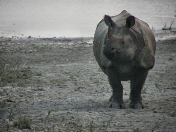 La primera activitat que fem és un elephant treking a la recerca de rinoceronts indis. Aquests posseeixen una sola banya, que per desgràcia es considera afrodisíac en algunes cultures i aconsegueix preus de 10.000$ per quilo, la qual cosa ha portat a aquest animal a la vora de l'extinció, quedant uns 2.500 al món, 400 d'ells al parc. Ràpidament donem amb un d'ells. És un animal enorme de dues tones de pes i 180 cm d'altura amb una espessa pell dividida en plaques a manera d'armadura. Per sort l'elefant, a més de ser la forma mes còmoda de moure's entre la densa jungla, és encara mes gran, i durant els 15-20 minuts que estem junt a ell es nota el respecte mutu. El rinoceront retrocedeix sense pressa buscant un altre lloc on pastorar a pocs metres quan s'apropa l'elefant, i aquest mai es posa davant del rinoceront per evitar envestides.