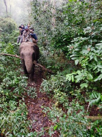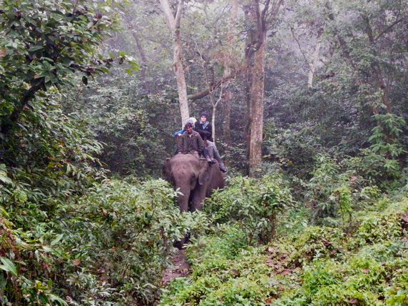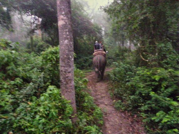 06:30 Elephant trekking a la recerca de tigres de bengala. Un altre animal de serios perill d'extinció, hi ha 2.500 a tot el món i al voltant de 120 en tot el parc natural. A la nostra illa hi ha comptabilitzats quatre, i el guia ens confessa que la mitjana d'albirament és de dues vegades al mes. Efectivament amb prou feines veiem animals. El passeig mereix la pena, la jungla a l'alba entre la boira és un paisatge meravellós.