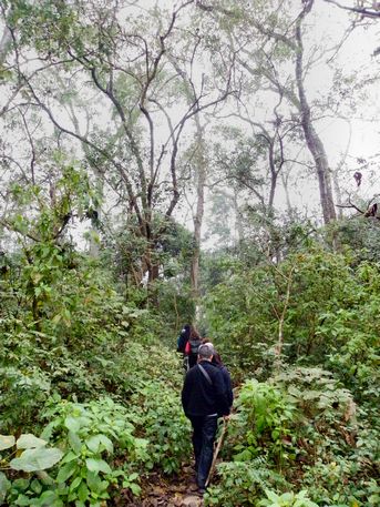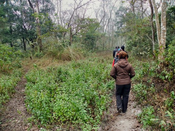 passeig per la selva ocasiona menys disturbi a la jungla i ha deuria brindar millors oportunitats d'albirament d'animals. Ens instrueixen sobre com actuar en cas de trobar-nos cara a cara amb un animal salvatge, com un rinoceront o tigre. Cap d'elles em convenç i crec que encomanar-se a la Verge serà el mes apropiat. A mesura que anem explorant el guia ens informa sobre els diferents tipus de plantes i herbes que ens trobem. Veiem algunes trepitjades i cagades de diferents espècies, però animals no veiem més que ocells. Després de 1h30 caminant iniciem un