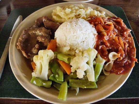 13:00 Menjar: sopa, plat combinat de pasta, arròs, carn de búfal, puré, patates i verdura.