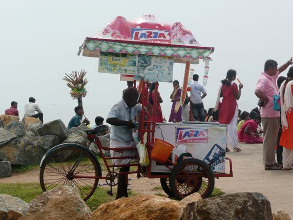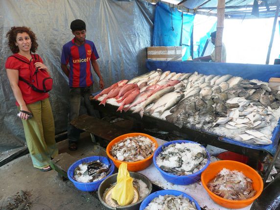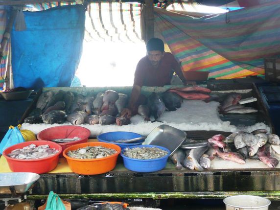 Al costat mateix, els pescadors aixequen tenderets on venen el que capturen. Es poden veure gambetes, llagostes, taurons, emperadors i tot tipus de peix variat que porten en les seves fràgils barques des de mar endins. Assessorats per Pablo, un hindú que parla un espanyol gairebé perfecte i que vesteix una samarreta del Barça regal de una amiga seva de Barcelona, vam comprar dues peces de peix i dos calamars. Acompanyats per ell anem al seu restaurant on ens ho cuinen com a plat principal acompanyat d'arròs amb coco i unes cerveses. Qualsevol de aquests tenderets ofereix el mateix servei, compres el peix al passeig, t'ho duus al restaurant i alla t'ho cuinen al teu gust.