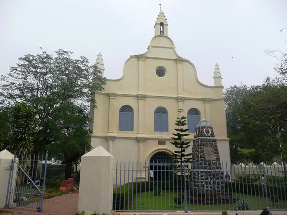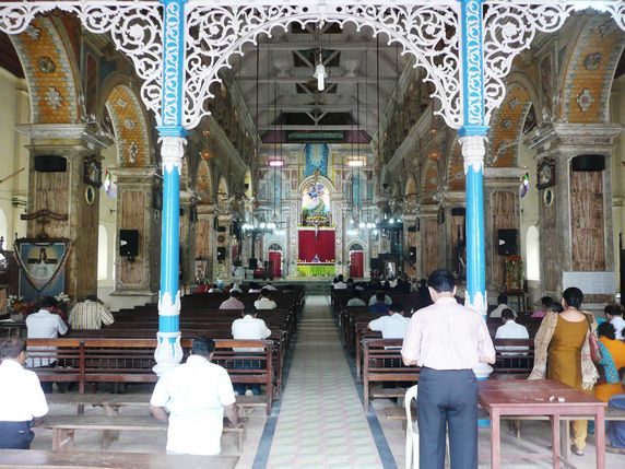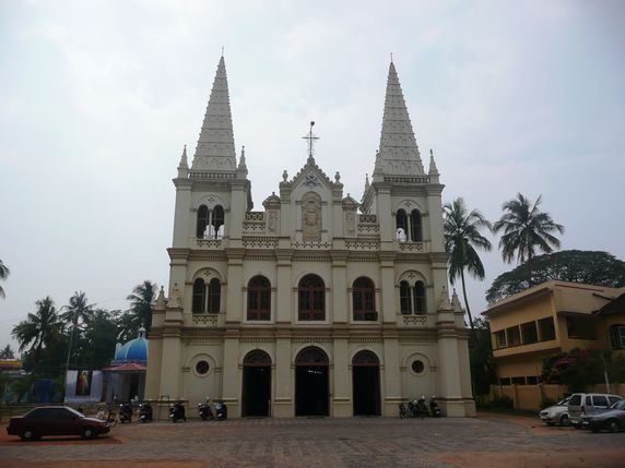 basílica de la Santa Creu. Va ser construïda pels portuguesos al 1505, i feta catedral en 1558. Quan els holandesos van envair Kochi al 1663 van destruir totes les esglésies catòliques excepte aquesta catedral i l'església de St Francis. Encara que si que ho van fer els britànics al 1795. L'estructura actual data de 1905. Al 1984, Joan Pau II, reconeixent-li la seva importància històrica la va elevar a la categoria de Basílica. Quan vam arribar estaven oficiant missa i no ens endinsem mes que un parell o tres metres. Aprofitant que comença a ploure, vam esperar a veure si acaba la ceremonia. Deixa de ploure i la missa encara no ha acabat. Ens anem a un altre cosa.