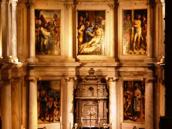 Al costat d'ella, ocupant l'antic emplaçament d'un hospital, després important mercat, i ara envaït per coloms entorn d'una estàtua eqüestre de Joan I, es troba la