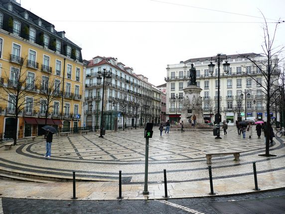 Rossio. El terra esta cobert amb els típics mosaics blancs i negres lisboetes formant diferents dibuixos. En el centre es troba l'estàtua de Pere IV, el primer emperador del Brasil independent, i al seu voltant sobris edificis ocupats per tendes de records, joieries i cafeteries. En la cara nord es troben el Teatro Nacional Doña María II i la imponent Estació de tren de Rossio.
