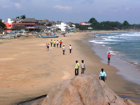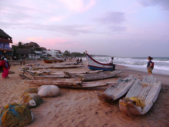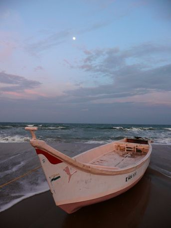 Fem una passejada per la riba fins al temple de la platja. Ens mullem els peus i poc mes. La sorra en algunes parts esta molt bruta. Furgant amb el peu, deixant-te enfonsar en la sorra per l'efecte de l'anar i venir de les ones, queda al descobert una gran taca de color negre que sembla quitrà. No s'enganxa als peus però tampoc és agradable. La sorra esta plena de barques de pesca amarrades. Tornant sobre els nostres passos fem algunes fotos del vespre i la lluna plena, abans parar a sopar marisc i peix fresc en algun restaurant a primera línia de brisa.