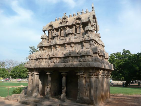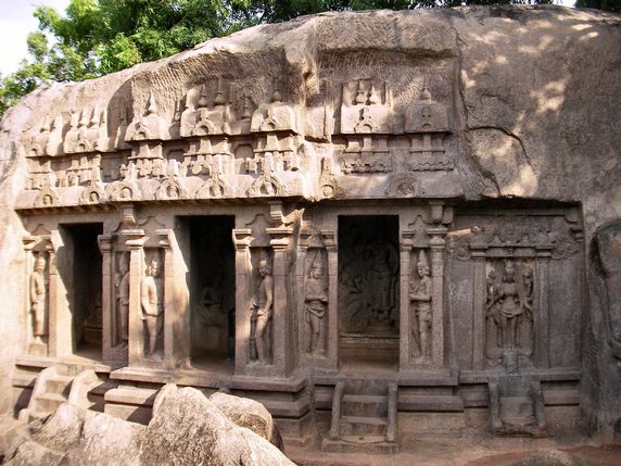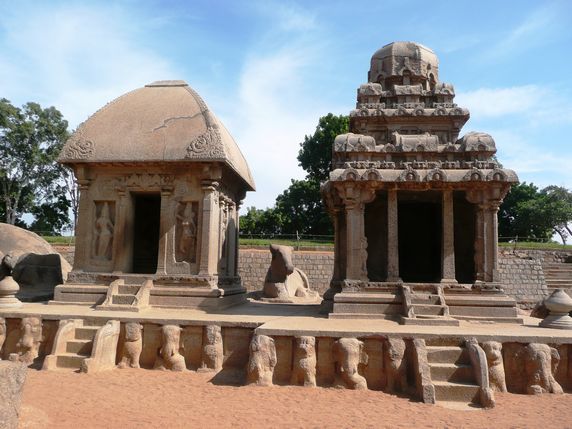 , literalment carros de guerra. Són uns petits temples del segle VII dedicats a Siva, però la tradició popular ha fet prevaler la creença que van ser creats pels herois del Mahabharata, que els van posar el seu nom: Draupadi-Ratha (la bella), Arjuna-Ratha (el valent), Bhima-Ratha (el fort), DharmarajaRatha (el bé) i Sahadeva-Ratha (el savi). Tots s'eleven sobre plataformes, que quan estan acabats imiten els passos processionals sobre rodes i animals. Tenen una sola nau, i els seus murs exteriors i interiors estan decorats amb pilastres encastades i altorrelleus dedicats a Siva.