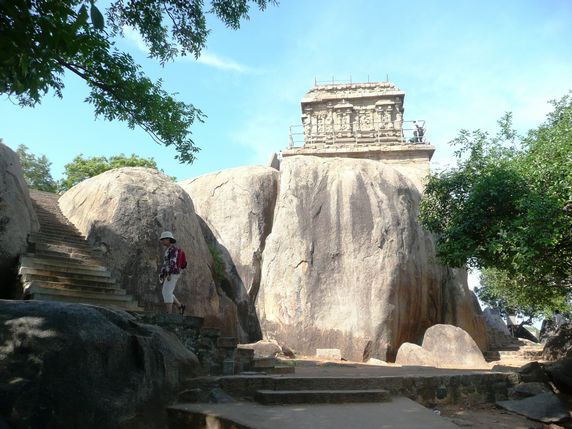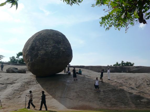 bola de mantega de Krishna, una gegantesca roca natural encimbellada en el vessant d'un petit pujol. Proporciona una agradable, encara que perillosa ombra.