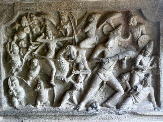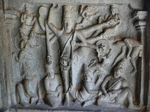 , un conjunt de petits temples i murals, espargits al llarg d'un petit pujol derrera de l'estació, que contenen relleus bellíssims representant històries de llibres sagrats. és una zona verda amb palmeres, petits boscos i roques enormes que tallen el pas. Esta plena d'hindús passant la tarda, i les confortables ombres alberguen alguna que altra parella. Entre escales en pedra i camins de terra anem d'un temple a un altre. Un dels temples més antics és el Krishna Mandapam, que mostra escultures en una escena pastoral amb Krishna aixecant la muntanya Govardhana per protegir als seus familiars de la ira de Indra.