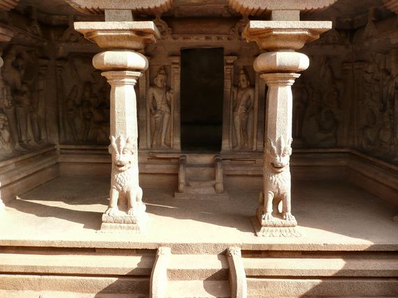 mandapams amb altorrelleus de grandària natural, dedicats en la seva majoria al culte de Vishnu. Les façanes presenten un pòrtic hipòstil, les columnes del qual tenen per base un lleó heràldic, l'emblema dinàstic dels