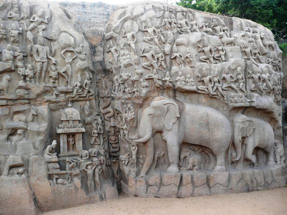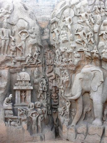 A la cara aquest (per la qual surt el sol) d'una enorme mole de granit (27 m de llarg per 9 m d'alt), que servia de paret a l'estany de ablucions del recinte sagrat, es va esculpir el mes gran relleu de tot l'art indi, per a eternitzar el Descens del Ganges, un dels passatges més espectaculars de la mitologia hindú, la