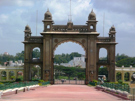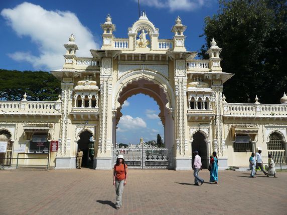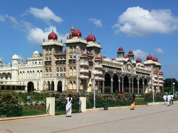 Va ser construït a la fi del segle XIV com a residència oficial de l'antiga família reial de Mysore. El palau ha sofert quatre reconstruccions. L'última, de 1912, és obra de l'arquitecte britànic Henry Irwin, qui ho va reconstruir després de l'incendi que ho havia arrasat gairebé per complet durant les noces de la princesa Jayalakshmanni al 1897. L'edifici principal està construït al voltant d'un jardí, on es troben 12 temples hindús, el més antic d'ells del segle XIV i el més recent de 1953. és una meravella arquitectònica, combinació d'estils davídic, indo-sarraí, oriental i romànic. Tres plantes de granit gris dominades per una torre de 44 metres d'alçada, coronada per una cúpula daurada. Al seu interior hi ha elaborades portes de fusta tallada, algunes amb incrustacions de plata i ivori, enormes llums d'aranya, figuretes de marbre, col.leccions de caixes on guardar joies, retrats de membres de la família reial, i altres objectes d'ús personal, que deixen clara evidència de l'opulència amb que vivien, tot això exposat en molt bastant bon estat de conservació. Al sortir ens netegem els peus. Amb una propina-suborn de 15 INR, aconseguim sortir per la porta nord, i estalviar-nos un bon passeig.