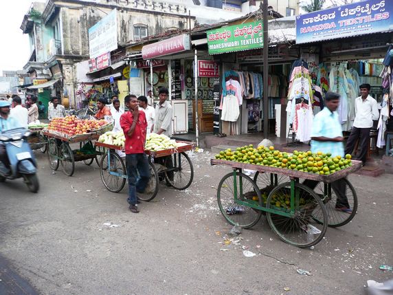mercat de fruita i verdura Devaraja, un dels més colorits i variats de l'índia. L'activitat és incessant durant tot el dia. Sorprèn l'especialització dels carros que ofereixen tot tipus de fruites i verdures. Un altre zona interessant per a passejar és