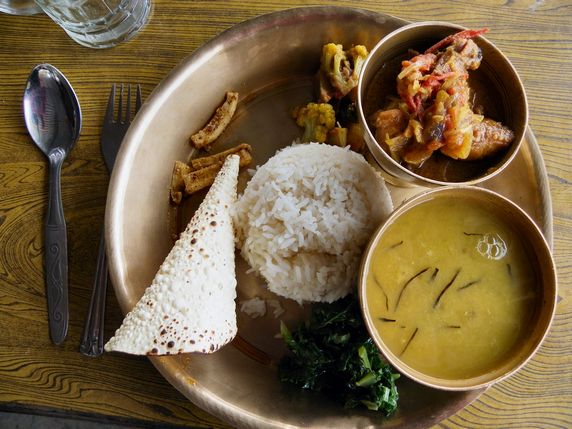 El 90% dels nepalesos són hindús, o sigui que professen l'hinduisme com a religió, i sigui per religió o no, majoritàriament són vegetarians. A excepció d'ingredients específics del país la gastronomia nepalesa és molt semblant a la cuina índia, es basa en arròs, verdures generalment condimentades amb curris que solen estar composts de gingebre, all i txile; i dhal, llenties sense pell. Tots ells poden acompanyar-se de chapati o nan, tipus de pa indi, o papad, fines tortitas fregides cruixents.