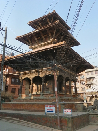 Prop d'aquí es troba el Temple Kumbeshwar, una espectacular pagoda de cinc plantes dedicada a Siva. Construït en 1.391 per JayastHiti Malla, és punt de peregrinació anual pels hindús durant el Janal Purnima quan les castes brhamin i chhetri reemplacen el cordó sagrat que penja sobre les seves espatlles. Els seus dos estanys es creu que contenen aigua del llac sagrat de Gosainkunda, al nord de la vall de Kàtmandu. Abans d'arribar a Durbar Square, a la plaça Swotha Tole, encara trobem els temples de Rada Khrisna, tipus pagoda,