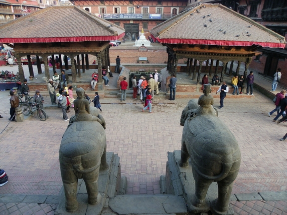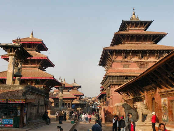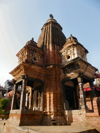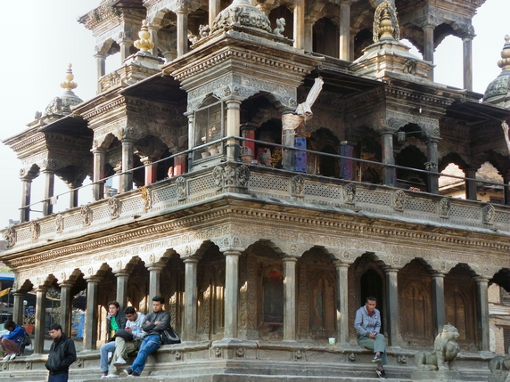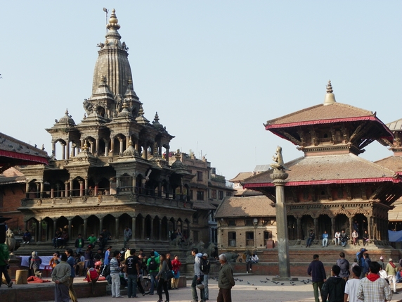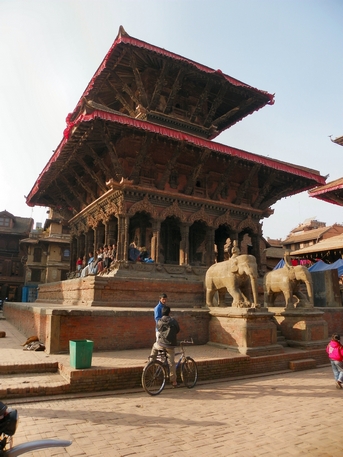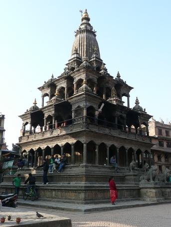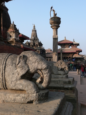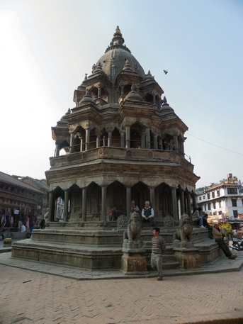Els últims minuts de llum passegem pels voltants de Durbar Square, seguint una mica la ruta al Sud-oest de Patan que marca Lonely Planet. Els carrers estan plens de gent, cada dos passos hi ha un temple, pagoda o estàtua d'algun déu que compaginen el seu caràcter sagrat amb tasques mes mundans com a expositors d'un mercat o estenedors de roba improvisats.