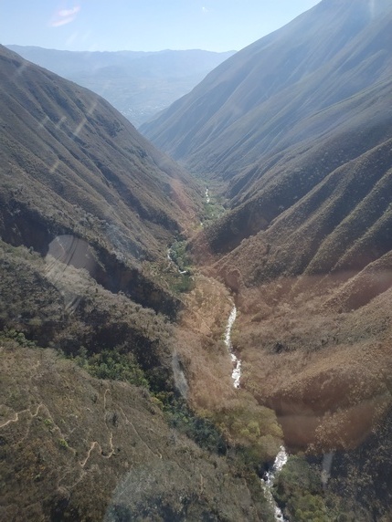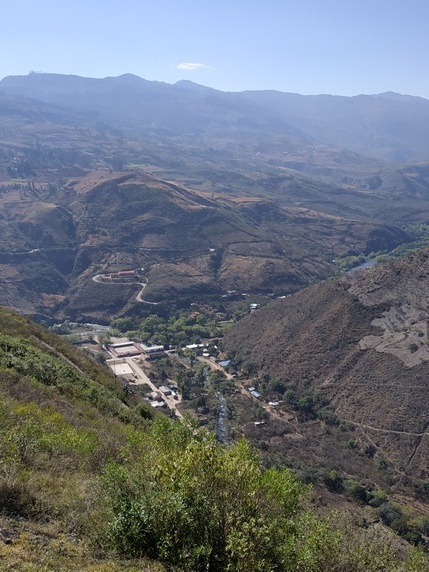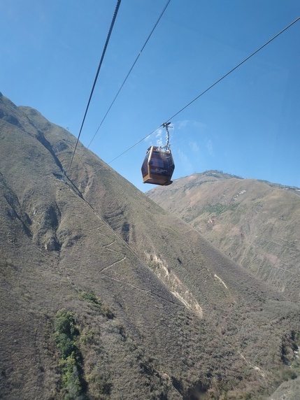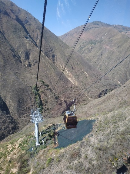 Salimos a las 6:20, las excursiones habitualmente empiezan entre 8 y 9 de la mañana, pero están haciendo obras en la carretera y la cortan al tráfico durante el día, así que hay que salir con tiempo para que no nos pille el cierre. Desde Chachapoyas a Nuevo Tingo se tarda una hora, desde allí a la boletería del teleférico dos minutos. Después un bus te lleva hasta la base del teleférico, donde en una cabina para ocho personas tarda 20 minutos en recorrer los 4km que hay de distancia hasta el otro extremo, en lo alto de la montaña. Aún quedan 2km, gran parte de ellos en fuerte pendiente, hasta las ruinas, que tardamos unas dos horas en visitar.