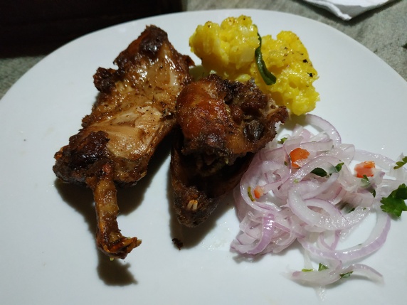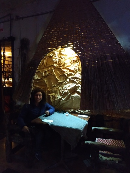 Batan del Tayta. Cenamos cuy andino, una especie de hámster gigante que hacen con papas y lo sirven crujiente dentro de un cofre. Luego pedimos dos tipos de pisco, uno de hoja de coca servido en una botella con forma de sarcófago de Karajia y el otro en medio coco. La comida muy buena, el cuy es tierno y gustoso, y el local bonito y con una decoración y presentación que no deja de sorprender. Atención excelente, 80 soles.