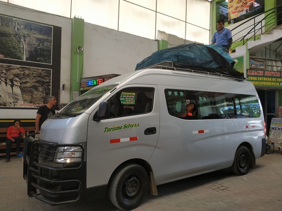 Turismo Selva, 35 soles. Ayer no quedaban asientos para las 06:30, así que compramos para el siguiente que sale a las 10:00. Es una furgoneta de 18 asientos, dos de ellos con medio respaldo. El viaje es largo, aunque conducen bastante rápido, en total son unas 8h. Hay numerosos tramos de montaña con curvas, los viajeros suben y bajan sin necesidad de que haya parada ni estación, además de las paradas oficiales en sus oficinas de Moyobamba, Nueva Cajamarca y Pedro Ruiz, a dejar y recoger mercancías; y una parada de 45 minutos en Aguas Verdes para comer en un buen restaurante de camioneros, 14 soles dos menús. Tilapia con arroz, frijoles y yuca, churrasco con plátano frito, y refrescos.