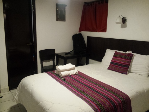 Hotel El Mirador, 110 soles en efectivo. Llevado por una encantadora abuelita y su familia, dispone de un bonito patio y una azotea con hamacas y buenas vistas. Habitación amplia, con baño privado y ventilador. Desayuno incluido: huevos al gusto, zumos, té / café, pan, mantequilla, mermelada y queso.