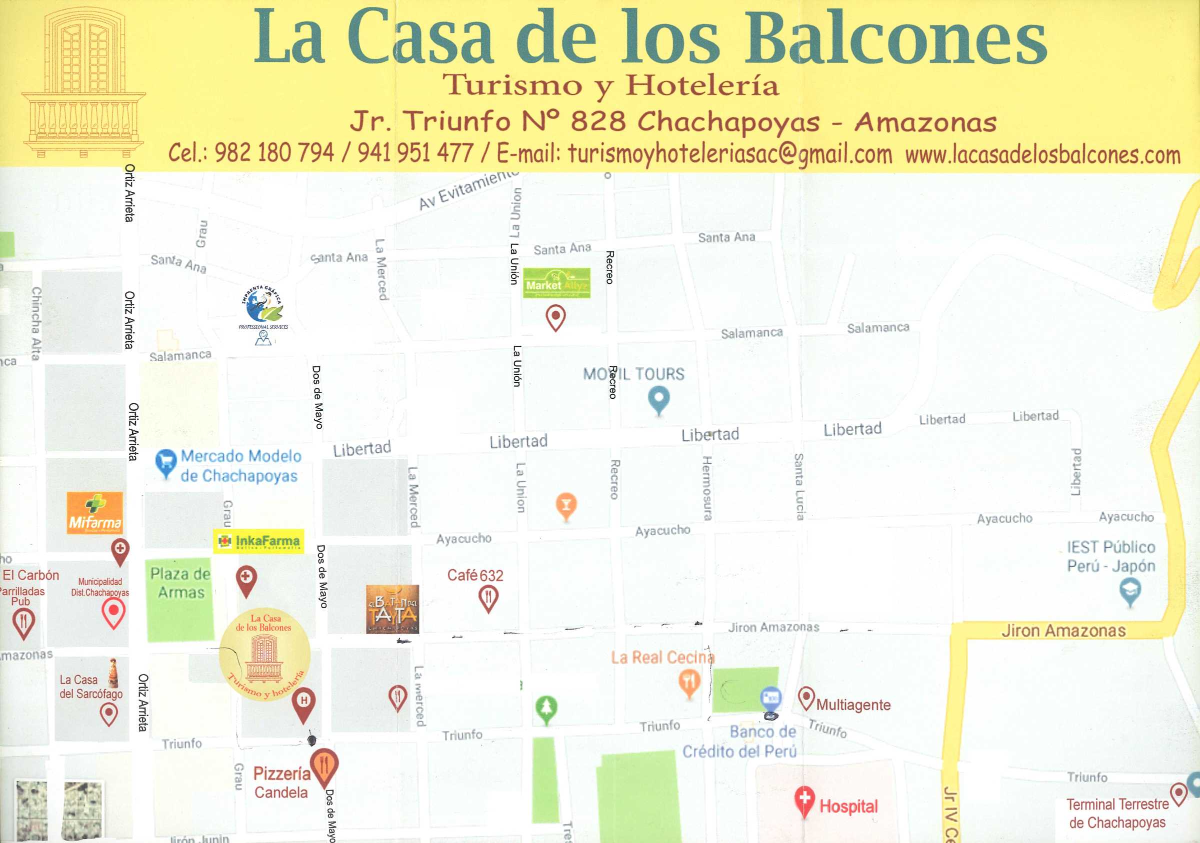 La casa de los balcones, 118 soles. En pleno centro de Chachapoyas, a una calle de la Plaza de Armas y paralela a la calle Amazonas, la zona peatonal y comercial más importante del centro histórico. Habitación doble con baño privado, desayuno incluido. Atención exquisita, ofrecen excursiones a través de Turismo Expeditions.