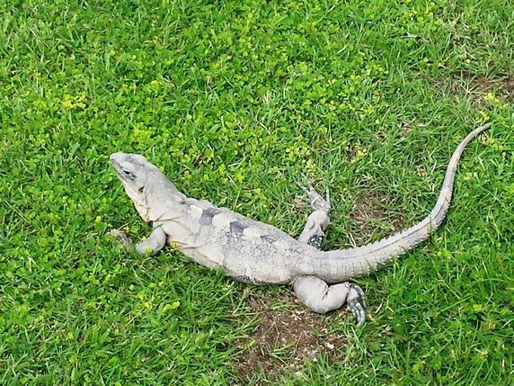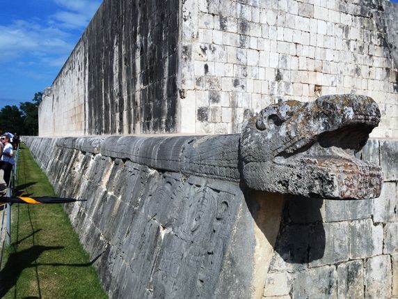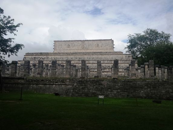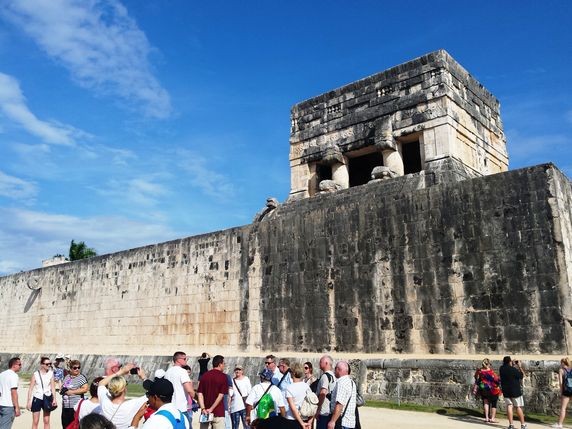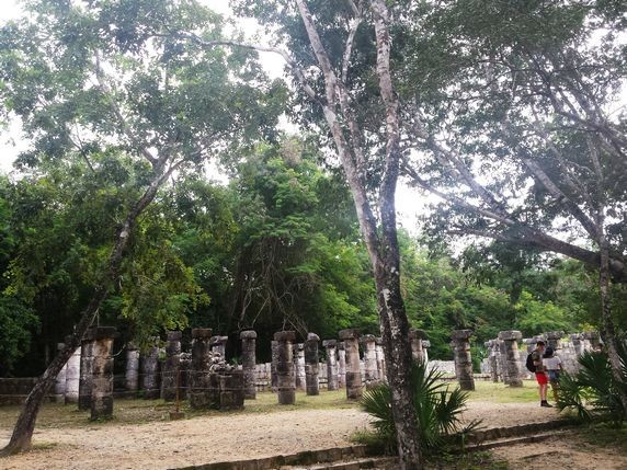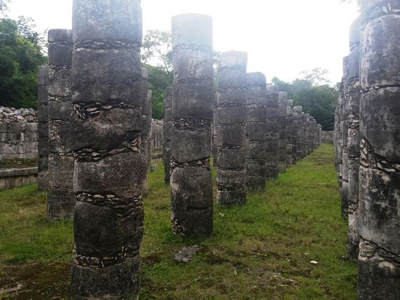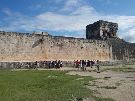 Chichen Itza (224 MXN el acceso, 30 MXN parquing), fue fundada por grupos mayas entre los años 325 y 550, alcanzando su máximo esplendor y poderío a principios del siglo XII. La primera estructura que vemos al entrar fue llamada por los conquistadores españoles en el siglo XVI "el castillo", se trata una pirámide de 25 metros de altura coronada por un templo dedicado al dios Kukulcán. Sin duda la estructura más imponente de todo el conjunto. Está ubicada en medio de una plaza, donde abundan las iguanas, de un tamaño equivalente a dos campos de futbol, y a su alrededor se distribuyen los restos de diversas edificaciones: varios templos, el grupo de las mil columnas, el juego de la pelota, y varios cenotes. En total tardamos unas dos horas en recorrerlo, me pareció que podían mejorarse las señalizaciones (es muy fácil desorientarse), aunque el mayor problema es el exceso de gente, por todo el recinto se multiplican como setas los tenderetes de recuerdos, los guías que se ofrecen y centenares de turistas.