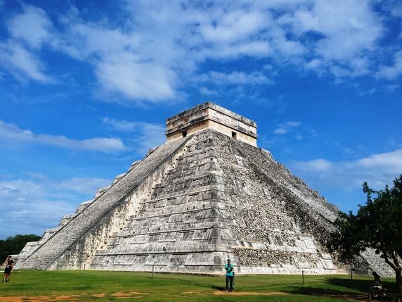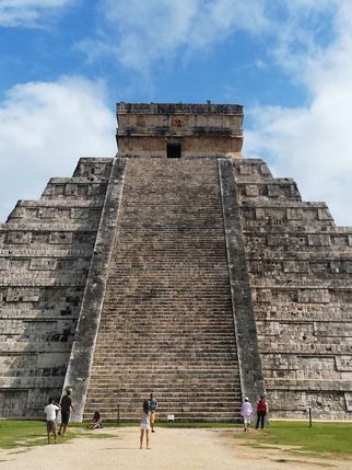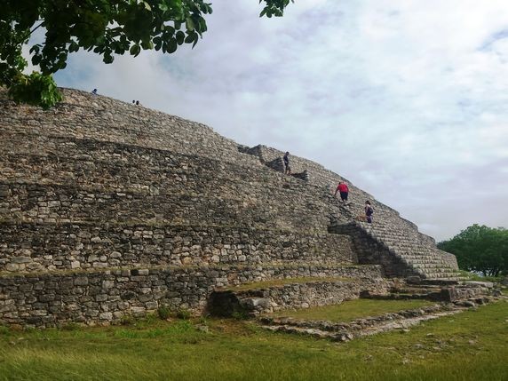 Templo de Kinich Kakmó, una enorme pirámide maya de 200 mts de base y 34 mts de altura, dedicada a una deidad solar que, en forma de guacamaya de fuego descendía diariamente a recoger las ofrendas que se le hacían.