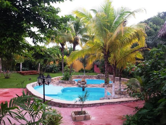 Eco Hotel Spa Itzamaltun, a dos calles de la plaza, 700 MXN. Casa de estilo colonial que dispone de un jardín muy bonito, frondoso y bien cuidado, con piscina, barbacoa, bar, futbolín y spa con area de masajes. Enorme habitación doble con desayuno continental incluido: frutas, tostadas, mermelada y mantequilla.