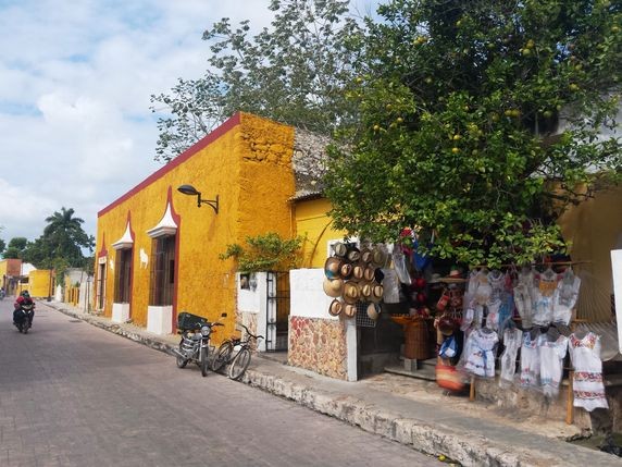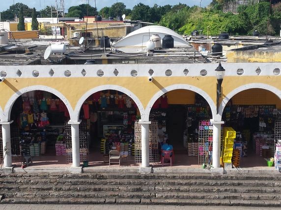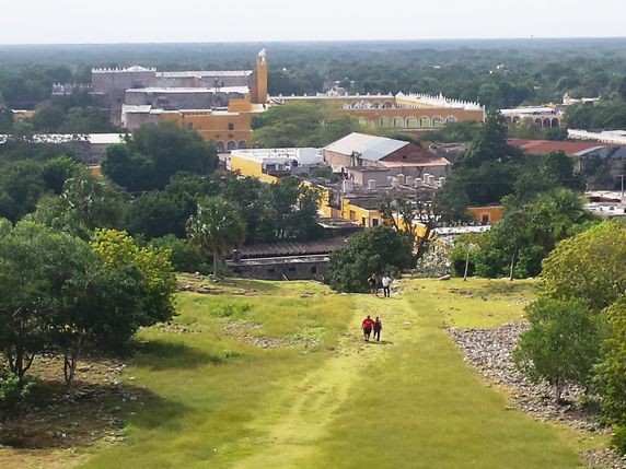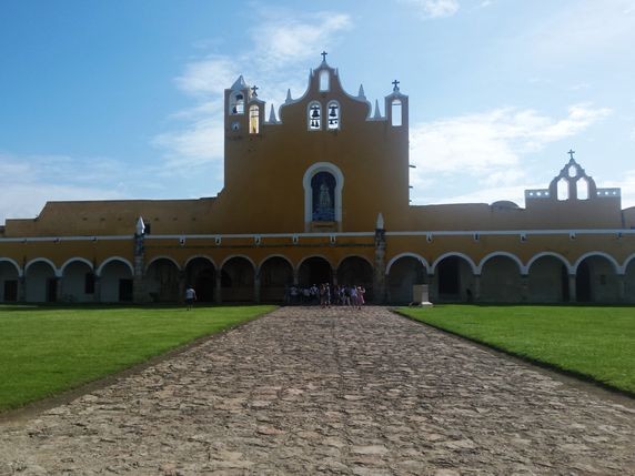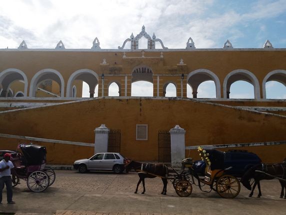 Izamal, una bonita ciudad colonial de mediados del siglo XVI, construida sobre los restos de una antigua ciudad maya. Lo primero que llama la atención, es que la mayoría de las casas y edificios del centro histórico están pintados de blanco y amarillo, los colores vaticanos, en honor a la multitudinaria misa que ofició Juan Pablo II en 1993, en la que consagro a Nuestra Señora de Izamal como reina y patrona de las etnias de América. El centro está dominado por el