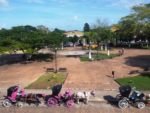 Tras desayunar nos acercamos al mercado (plaza del convento) a comprar algo de fruta (4 manzanas y 4 plátanos, 26 MXN). La carretera 180D hasta Mérida (1h15) es una calzada de dos carriles, bien pavimentada, que atraviesa tres o cuatro pueblos.