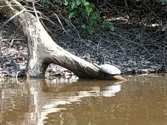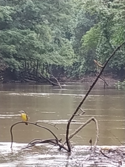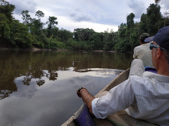 Al igual que ayer, vemos todo tipo de animales durante el camino, estos son solo algunos de los que recuerdo: águila luama, águila vieja, victor diez, guanaco rojo, delfines, monos fraile, lobos de río, tortugas taricaya, tucanes tabaqueros, papagayos, iguanas, paiches, pájaro tatatao, monos negros, ranas torito. A mitad de camino paramos en Poza Galicia, un lugar donde el río es más profundo y es fácil ver a los delfines saliendo a respirar, y a los paiches saltando y golpeando con el lomo sobre el agua.