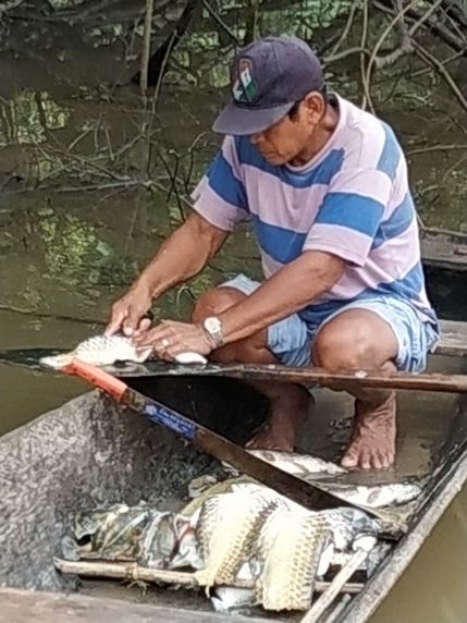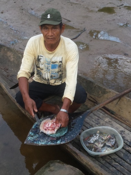 De momento no hay nadie, el otro día estaba lleno, supongo que no tardaran en llegar. En Panteón compramos pescado a Jacinto, el guardabosque, por 10 soles, araguana para comer y acaguaso para cenar. En cada cabaña / puesto de vigilancia hay alguien que, , en turnos de diez días, se encarga de cuidarlo y mantenerlo limpio para quien venga. Así como vigilar el pequeño huerto de huevos de tortuga, que contiene unos 200 ejemplares.