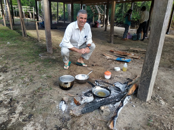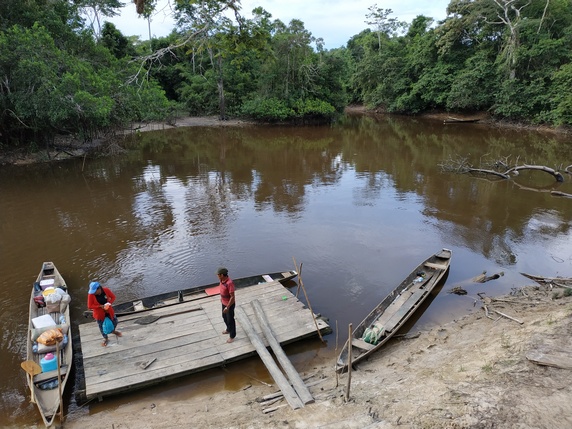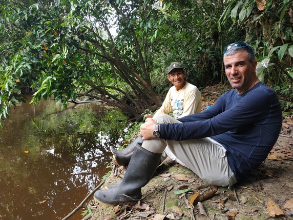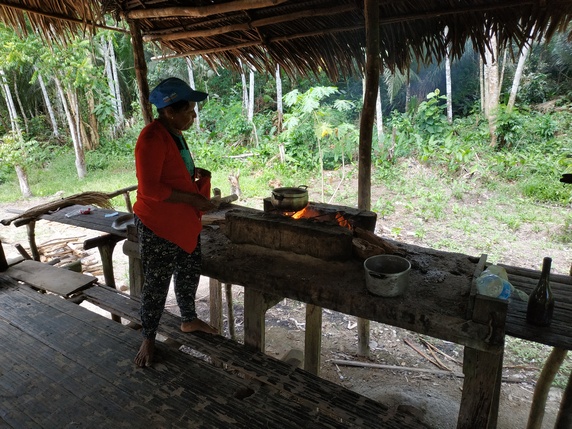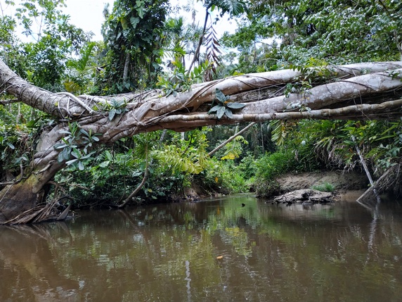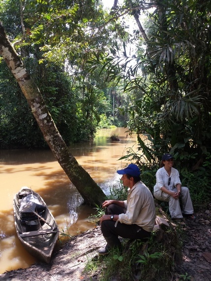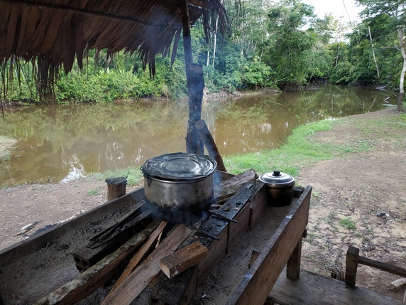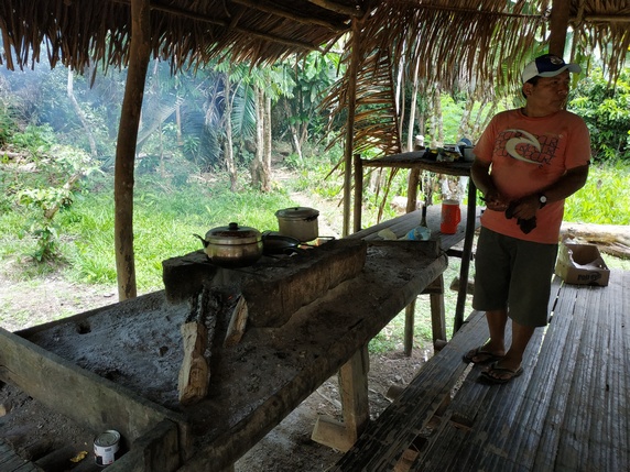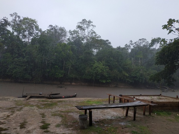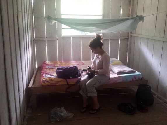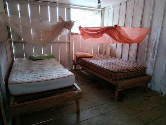Las horas de calor son entre las 10h y las 15h30. Aunque seguramente no es la mejor opción para unos blanquitos atrae mosquitos, vamos descalzos o en chanclas la mayor parte del viaje, hace demasiado calor para llevar el pie cubierto, solo usamos las botas de agua durante las excursiones. En la barca no hay que preocuparse de los mosquitos, curiosamente solo pican cuando estás en tierra. Hoy dormimos en el puesto de vigilancia Camotal, de aspecto exterior es más moderno que Poza Gloria, pero por dentro es más o menos lo mismo que ayer. Hay media docena de habitaciones sin cama ni estanterías ni nada, solo arañas, cucarachas y demás bestias, hay que dormir en el suelo. Montamos una cama en el suelo con colchonetas y una sábana, y lo cubrimos todo bien con la mosquitera.