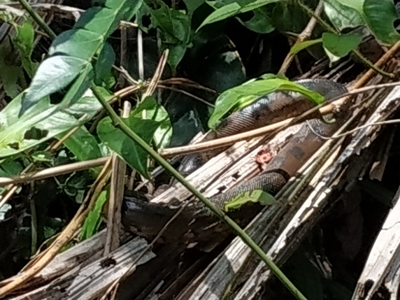 Después de cenar salimos a ver cocodrilos. No hay que alejarse más que unas decenas de metros para ver los primeros. Se ven claramente sus ojos sobre el agua cuando los alumbras con la linterna. Vimos un montón, y Wellington cogió un par de ellos, de no más de medio metro, para verlos de cerca en la barca. Vimos también una serpiente loro machaca, una especie muy venenosa según nos dijo, y de forma fugaz, un puma bebiendo en la orilla, que huyó nada mas notar nuestra presencia.